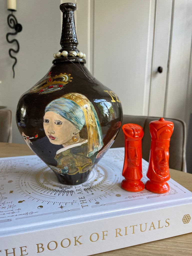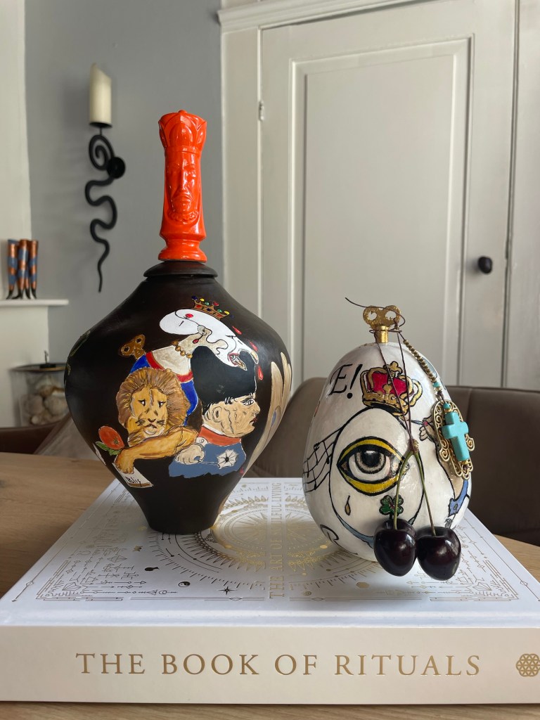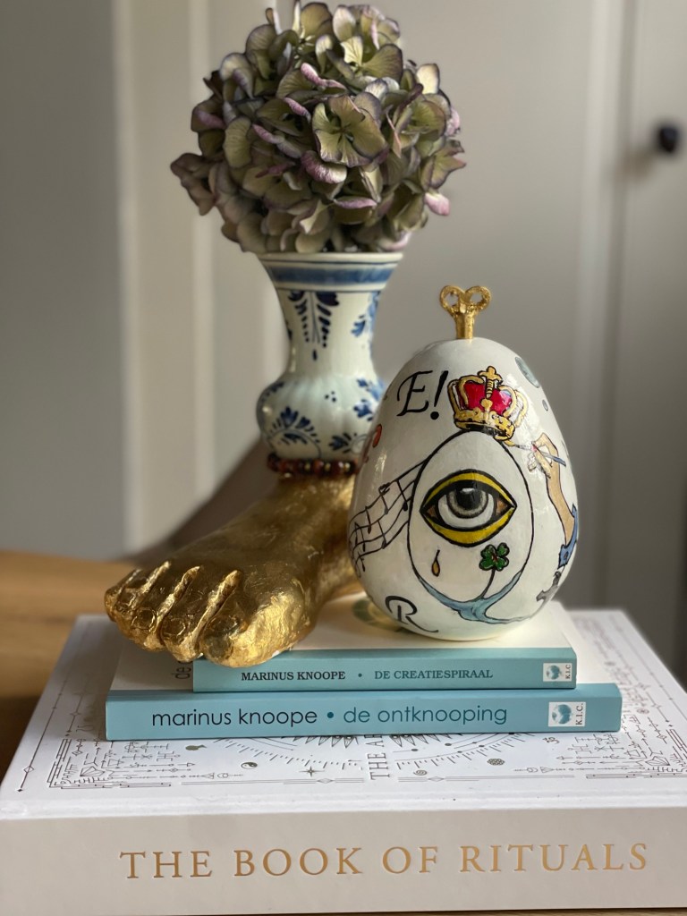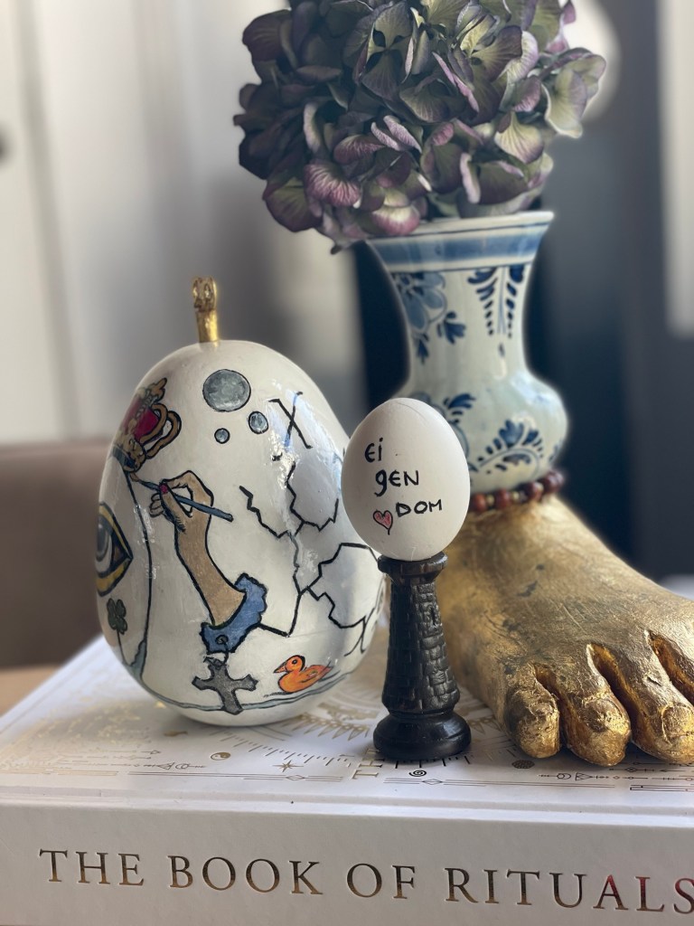 Ik leg een paarden / vlecht tegen een vaas, ik zet een paard naast een ei. Het ei zegt: “ei-gen vrouw”.